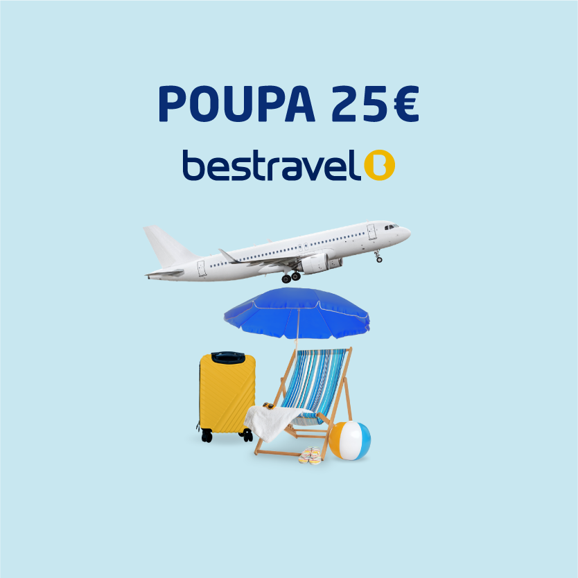 Vale (em código) de 25€ válido até ao dia 31.01.2026, em vendas iguais ou superiores a 500€ + taxas, nas agências viagens Bestravel aderentes. Não é válido para vendas de “só avião” Não se aplicam a viagens de transporte puro (voos, autocarros, barcos, rent-a-car). Limitado a 1 vale por viagem / reserva. Valor não redimível em dinheiro.. Não aplicável em pagamentos com cartão de crédito ou indexados a outras parcerias. Não acumulável com outras campanhas em vigor.